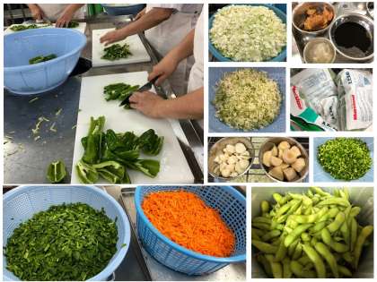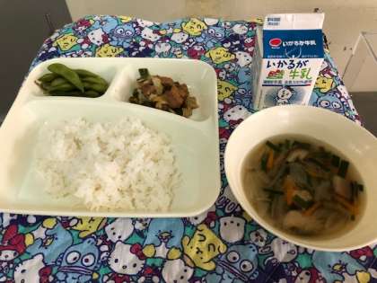 今日の給食では、豚肉をゆでてから、他の材料と一緒にいためて味つけしています。