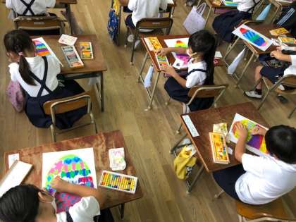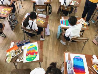 1年生が、図工の時間にクレパスを使ってカラフルな卵の絵を描いています。