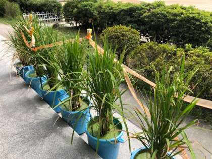 理科室前のポリバケツで栽培しているイネが、稲穂を徐々に膨らませてきました。