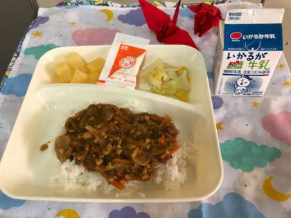 今日は、小麦粉の代わりに、米粉を使ったカレールウの素で味つけしました。
