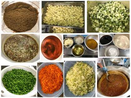 牛ひき肉、豚ひき肉、たまねぎ、グリンピースを炒め、味つけし、ごはんにかけて食べます。