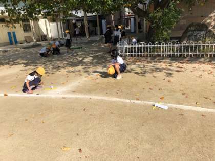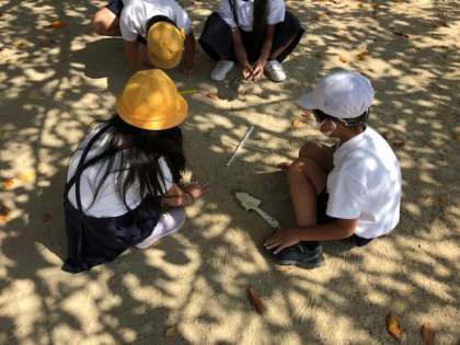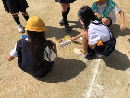 3年生が、理科「かげと太陽」の学習で日向と日陰の地面の温度を調べました。手で触れた感覚で温かさの違いは分かりますが、温度計を使って科学的に比較し理解を深めていきます。