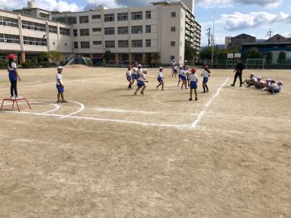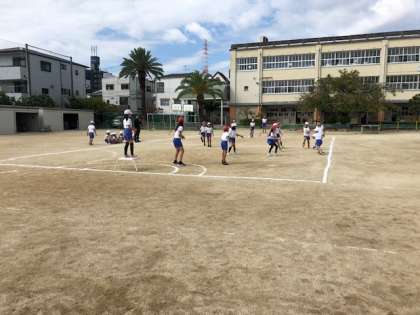 4年生は、体育の時間「ボールゲーム」の学習でポートボールをしました。チームメイトに声をかけてパスをつないでゴールまで運んでいます。空いたスペースに走りこむよい動きもできていました。