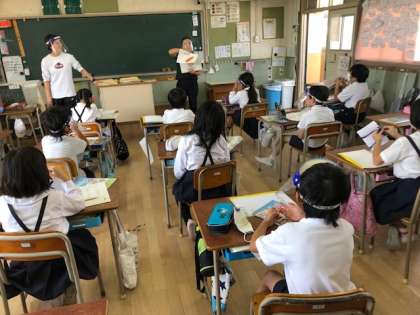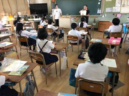 3年生が、ベン先生と外国語活動を楽しみました。ベン先生が掲げる逆さの絵カードを見て受けごたえします。