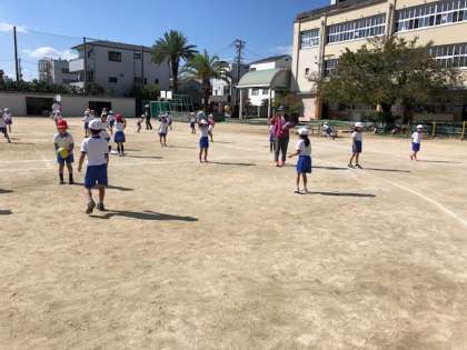 1年生は、体育の時間に「ボールゲーム(ボール投げ)」をしています。ボールを投げること、受けることを円形ドッジボールのゲームで楽しみました。
