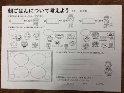 5年生、栄養指導「朝ごはんについて考えよう」で食物の3つのはたらきを理解し、栄養のバランスのとれた朝ごはんを各々で考えました。