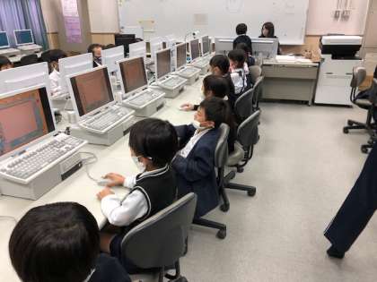 1年生が、生活科の時間にパソコン教室でパソコンの基本的な操作を学びました。