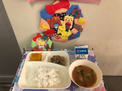 今日の給食には、かぼちゃを混ぜた「かぼちゃういろう」が登場しました。