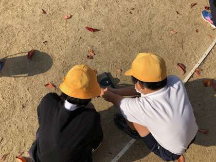 晴天のもとで、虫メガネを使って太陽の光を集め、黒い紙を焦がすほど高温になることなど、その様子について観察し理解を深めました。
