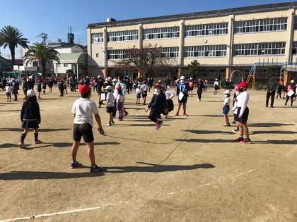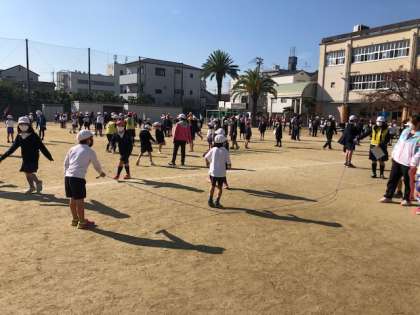 今日は快晴で温かくなりました。なわとび運動は、運動量が豊富ですので、短い時間で少し汗ばんできます。跳び方が「大波小波」から「回旋跳び」に難度が上がっても、たてわり班で楽しく運動に取り組むことができました。