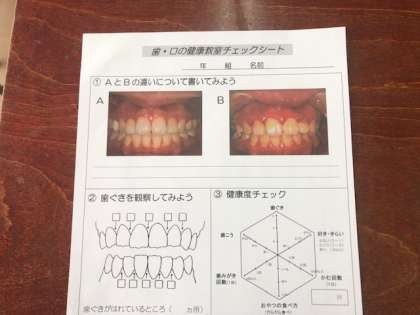一生使う歯を健康に保つために、大切な事柄を写真や動画を使って分かりやすくお話していただきました。「歯・口の健康チェックカード」に各自の健康状態を記録して確かめました。