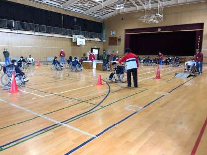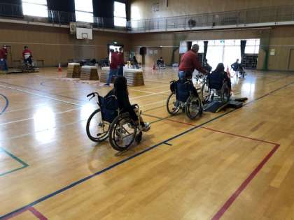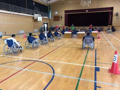 体育館では、5年生一人一人が、車いすに乗ってジグザグやUターン、簡単なスロープ、狭い通路、段差などの模擬コースで自走体験を通して、車いすの感覚を理解しました。