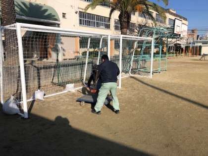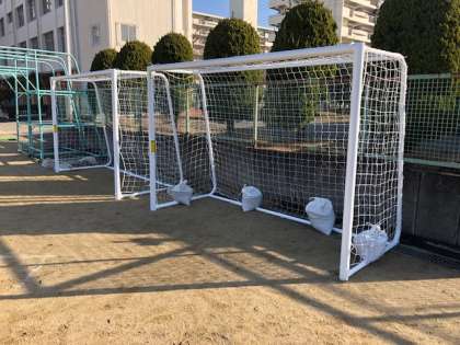 サッカーゴールを新調しました。長年の使用で劣化してきましたので、取り替えました。今までのようにミニゲームやシュート練習などサッカーを楽しんでたくさん体を動かしましょう。