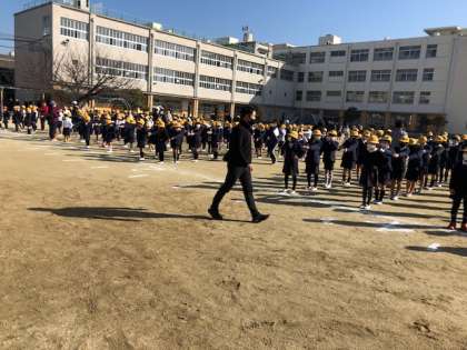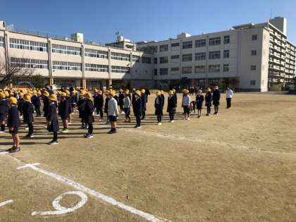 地震と津波を想定した避難訓練をしました。地震発生で自身の安全を確保するために机の下に身を隠します。余震が収まったのを確かめてから運動場に避難します。