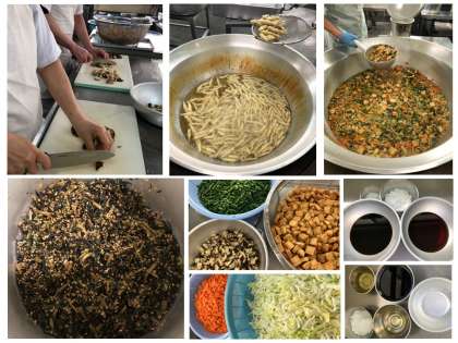 2,だいこん葉、ひじきの順に油でいため、砂糖、みりん、こい口しょうゆ、湯を加えて更にいためます。