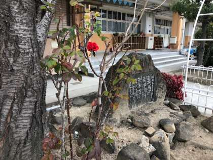 30周年記念の歌碑のそばで、バラが咲いていす。寒さの中で、児童の皆さんを応援してくれているようです。