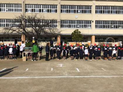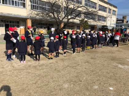 今週は、6年生の卒業をお祝いする1週間です。木曜日の集会では、6年生の一人一人に感謝のメッセージカードが送られました。運動場に1列に並んだ6年生の一人一人の首に、1年生がプレゼンターとして感謝の気持ちを込めてかけました。1年生から5年生の学年ごとに分かれて1年「6年生の」、2年「おにいさん」、3年「おねえさん」、4年「ご卒業」、5年「おめでとうございます。」のよびかけで感謝の気持ちを伝えお祝いしました。
