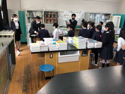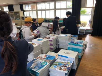 新しい教科書が配付されました。進級して、新しい教科、新しい学習単元を楽しみに教室へ運んでいきました。