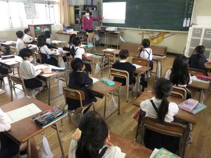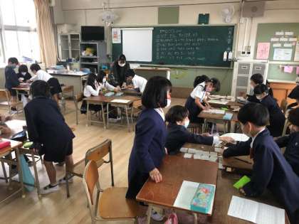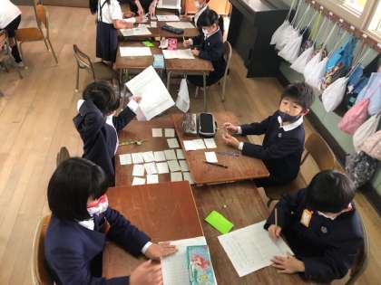 2年生が、算数「表とグラフ」を学習しています。「好きな〜」を書いたカードを持ち寄って、表にまとめることに取り組みました。身の回りにある数量を分類整理し、簡単な表やグラフを用いて表したり読み取ったりする学習です。