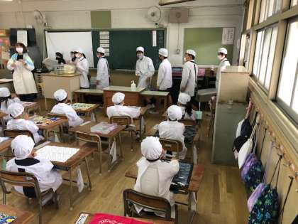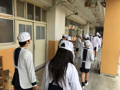 1年生の給食準備について、6年生が、食器・食缶の運搬と配膳のお手伝いをしてくれています。 とりあえず、4月いっぱいを目途にしています。6年生のお手本を参考に1年生が、自分たちでするときを楽しみにしています。