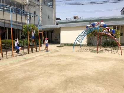 4年が、体育の授業で運動場の施設を順番に回るサーキット型の運動で楽しく体を動かしていました。