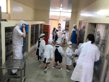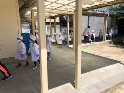 1年生は、給食室で主菜・副菜のおかず食缶、食器、牛乳、主食のごはんを2人1組になって教室まで運び、協力して配膳をします。給食の準備も、集団生活の大切な学習です。