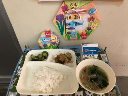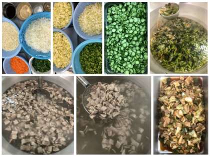 今日の給食では、豚ばら肉をゆでてから、他の材料といためています。