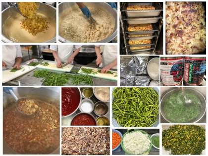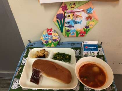 今日の給食では、コーンフレークを敷き詰めた上に卵、クリーム、砂糖、小麦粉、りんご(カット缶)を混ぜたものを流し入れて、蒸し焼きにした、「りんごのクラフティ」が登場しました。