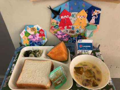 今日の給食では、わかめ、茎わかめ、昆布、赤とさかのりを使った、「ミックス海そうのサラダ」が登場しました。