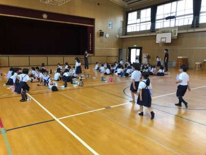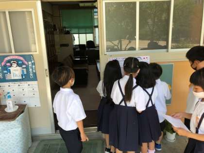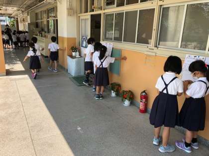 1年生が、2年生の案内で学校内の各教室を回り、それぞれの教室の使い方や役割について学びました。1年生にとっては、広い学校内は、たんけん感覚で興味を持って学んでいました。