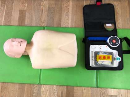DVD映像による解説で理解を深めた後、実習用の人形とAEDを使って、心肺蘇生(人工呼吸・心臓マッサージ・AEDの使用)の一次救命処置をマスターしました。