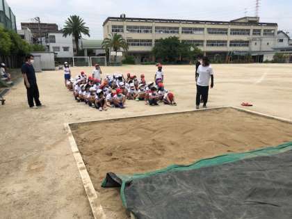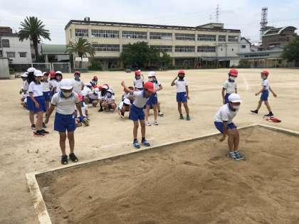 4年生が、体育の時間に新体力テスト種目の「立ち幅跳び」の練習をしました。より遠くへ跳ぶコツや正しい測定のし方についての説明を受けたあと、練習に取り組みました。