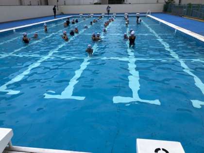6年生は、昨年も水泳学習がありました。今年は、最高学年として小学校最後のプール水泳学習です。前半に水慣れをして、後半は25m、50m、100mを目標にした3グループに分かれて泳ぎました。