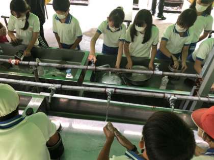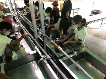 鍋や飯盒を元のピカピカに戻るまで、みんなできれいに洗いました。