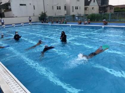 昨年度、プール水泳学習ができなかった2年生は、今年の水泳学習期間で、水中を歩く、走る移動や浮く、もぐる運動遊びで、息を止めたり吐いたりしながら水中での活動(運動遊び)ができるようになりました。