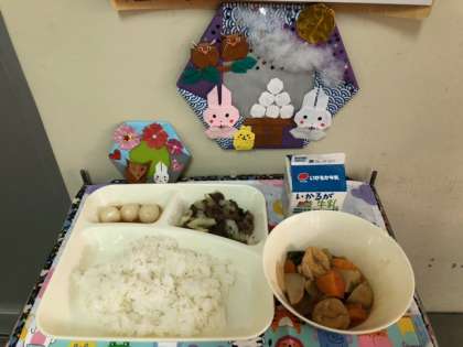 今日は、月見の行事献立として、芋を使った「一口がんもとさといものみそ煮」、だんごを使った「みたらしだんご」が登場しました。