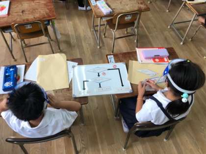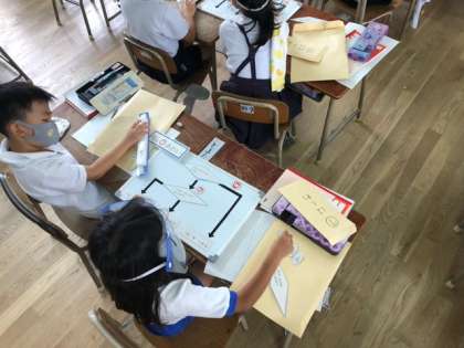 1年生は、国語単元「うんどうかいのおもいでをつたえよう」で、助詞の「は」「へ」「を」の正しい使い方を理解し、自分の、思ったことを相手に伝わるように文章を書く学習に取り組みます。