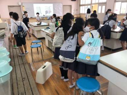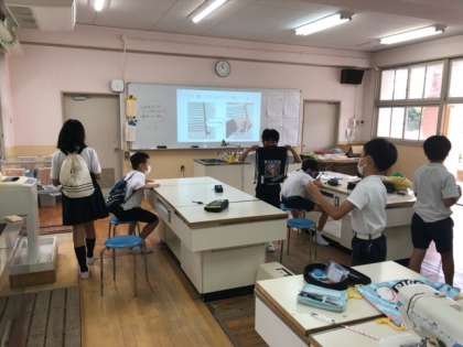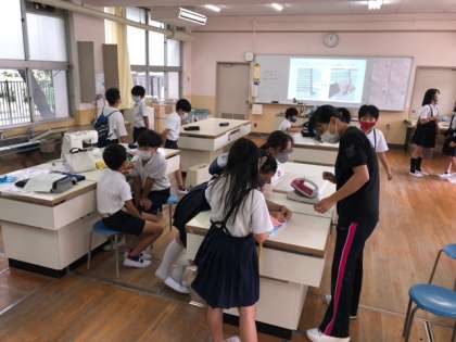 5年生は、家庭科の時間、ミシンを使った裁縫の学習で、手作りナップサックに取り組んでいます。