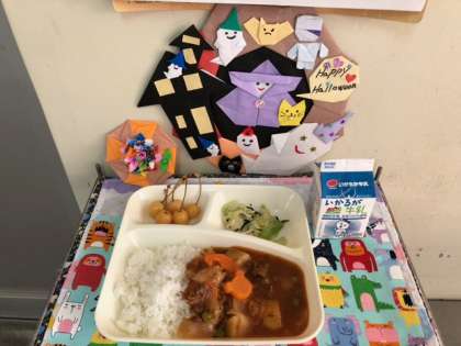 今日のハヤシライスには、にんじんをくまの型でぬいた、「ラッキーくまさん」も入っていて、子どもたちも喜んで食べていました。