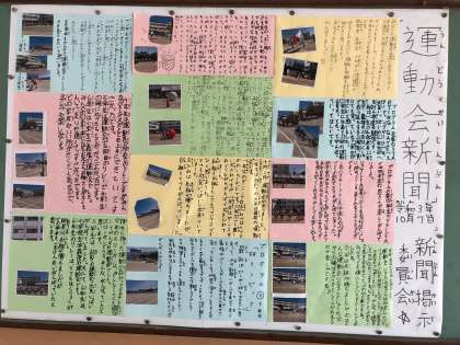 新聞掲示委員会が、運動会新聞を壁新聞で作成してくれました。印象に残ったシーンや楽しかった感想など児童一人一人の思い出がたくさん載っています。ご来校された際にご覧ください。