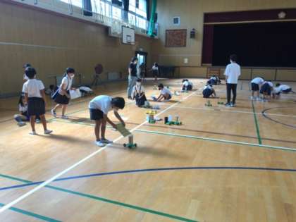 3年生が、理科「風とゴムの力のはたらき」の学習で各自、実験器具を組み立てて調べました。