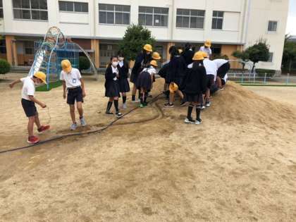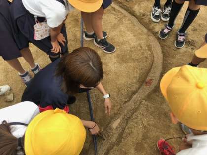 運動場の土山を使って、S字の水路に水を流してその様子を調べ考察しました。