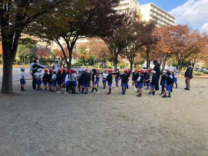 公園の紅葉や落ち葉拾いで季節に触れ、広場で鬼ごっこなどをして楽しく遊びました。また、往復の道中、交通ルールや安全な歩行を守って学習することができました。