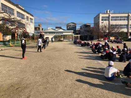 今朝の児童集会は、先生の連続なわとび持久競争で引っ掛かることなく、誰が最後まで残ることができるかが、クイズになりました。