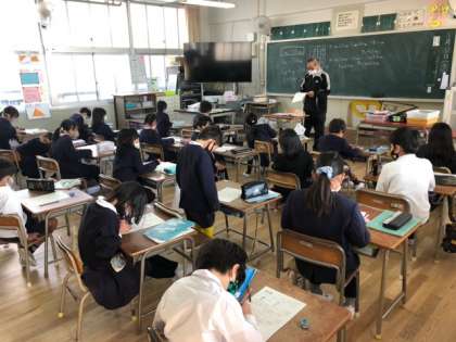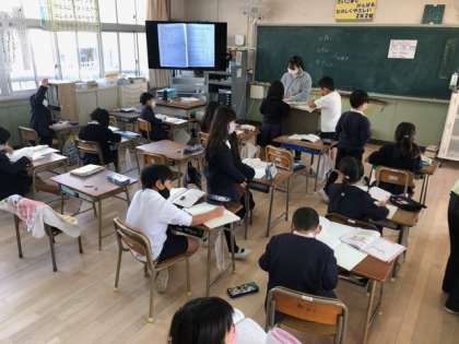 つながった机の長さを「何メートル何センチメートル」で足し算や引き算で求める問題に取り組んでいます。