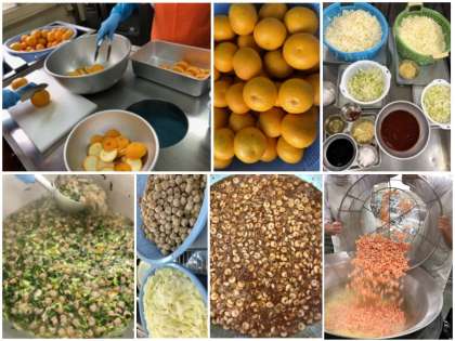 給食では、精白米を多めの水で柔らかく煮、具に肉だんご、だいこん、チンゲンサイ、にんじんを入れ、チキンブイヨン、しょうゆ、塩で味つけをしています。仕上げにごま油で風味をつけています。