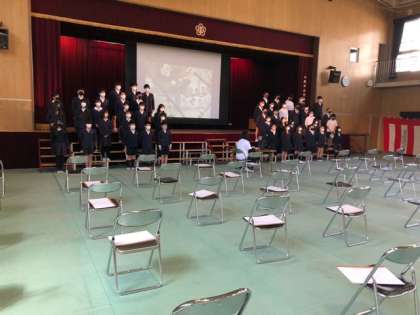 卒業式予行、5年生が参考に見守る中、本番さながらの緊張感がありました。