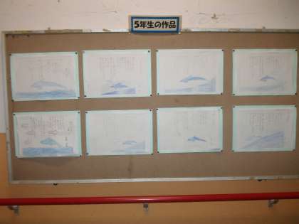 校舎の2階や3階に上がる途中(1年生は1階)に、各学年の作品を掲示しています。