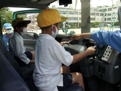フードロスやごみ捨てのルールなどを学習した後、パッカー車の運転台に座り、各種スイッチパネルについて説明を聞くなど、大変貴重な体験をすることができました。