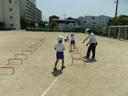 グループごとにローテーションして移動し、さまざまな動きの運動をみんなで経験することで、友だちとの仲も深まっているようです。